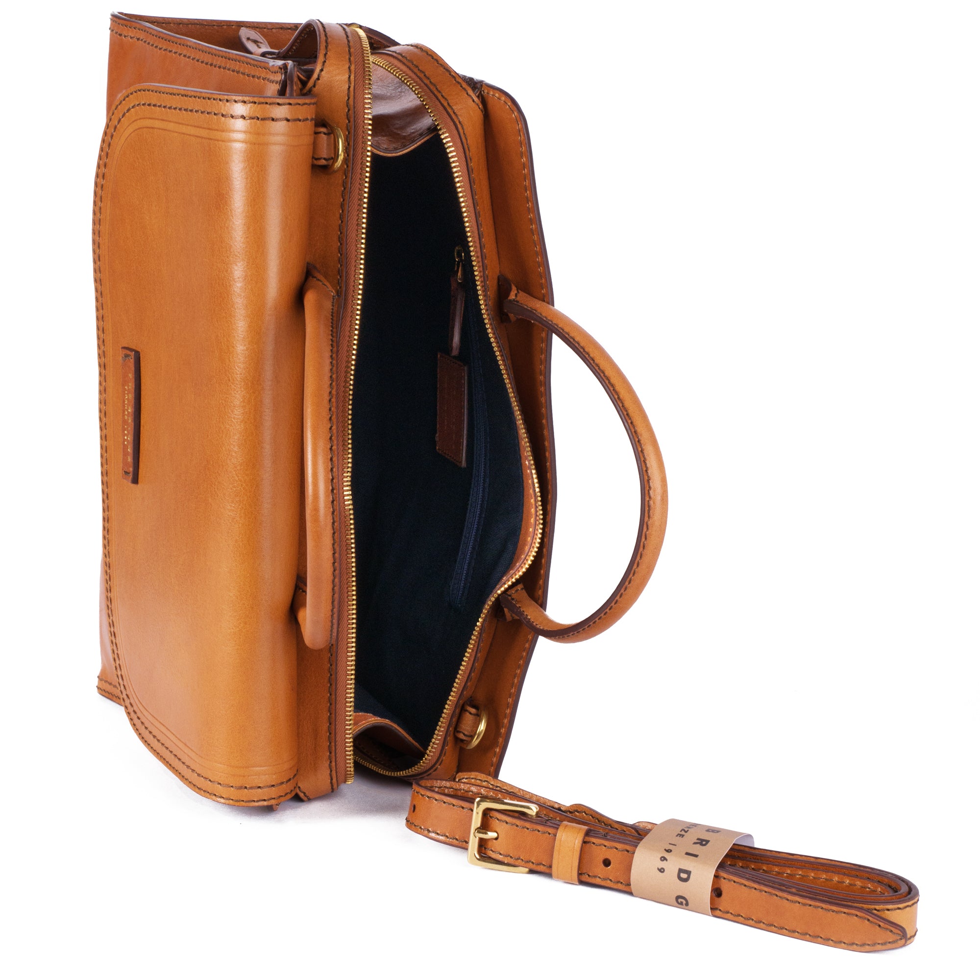 - A beautifully structured handbag from The Bridge. Envelope stitching around the main body ensures that the bag keeps it's shape when put down whilst the flap front compartment and detachable shoulder strap make it a practical usable bag.