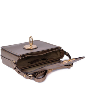 - A beautifully proportioned bag featuring a locking clasped brass fastening. Again, beautiful stitch work and leather detailing have resulted in an absolutely stunning, medium sized handbag. One for those looking for a classic in a slightly different shape.