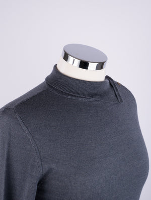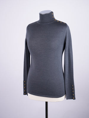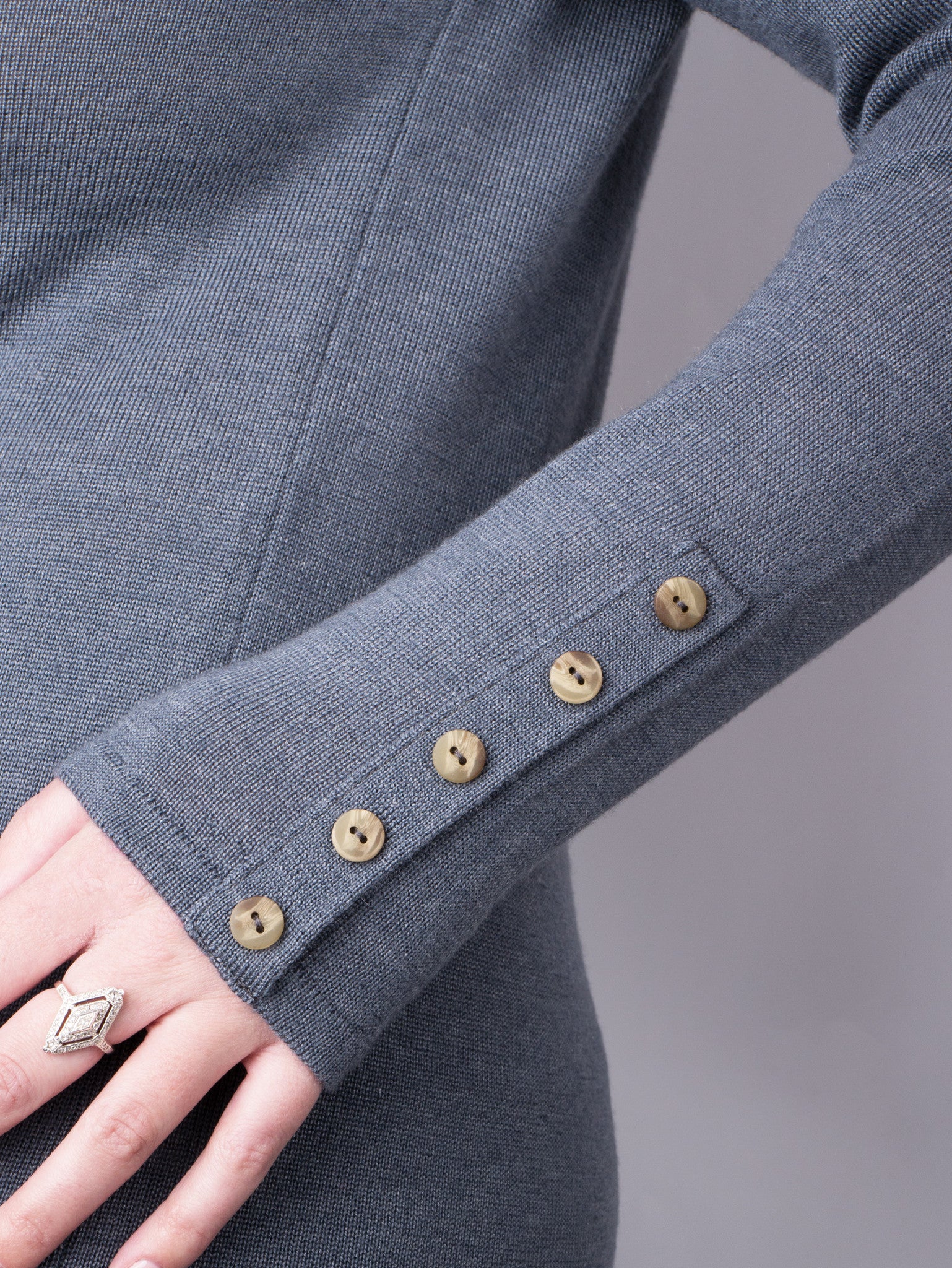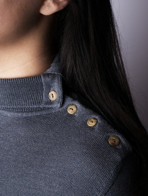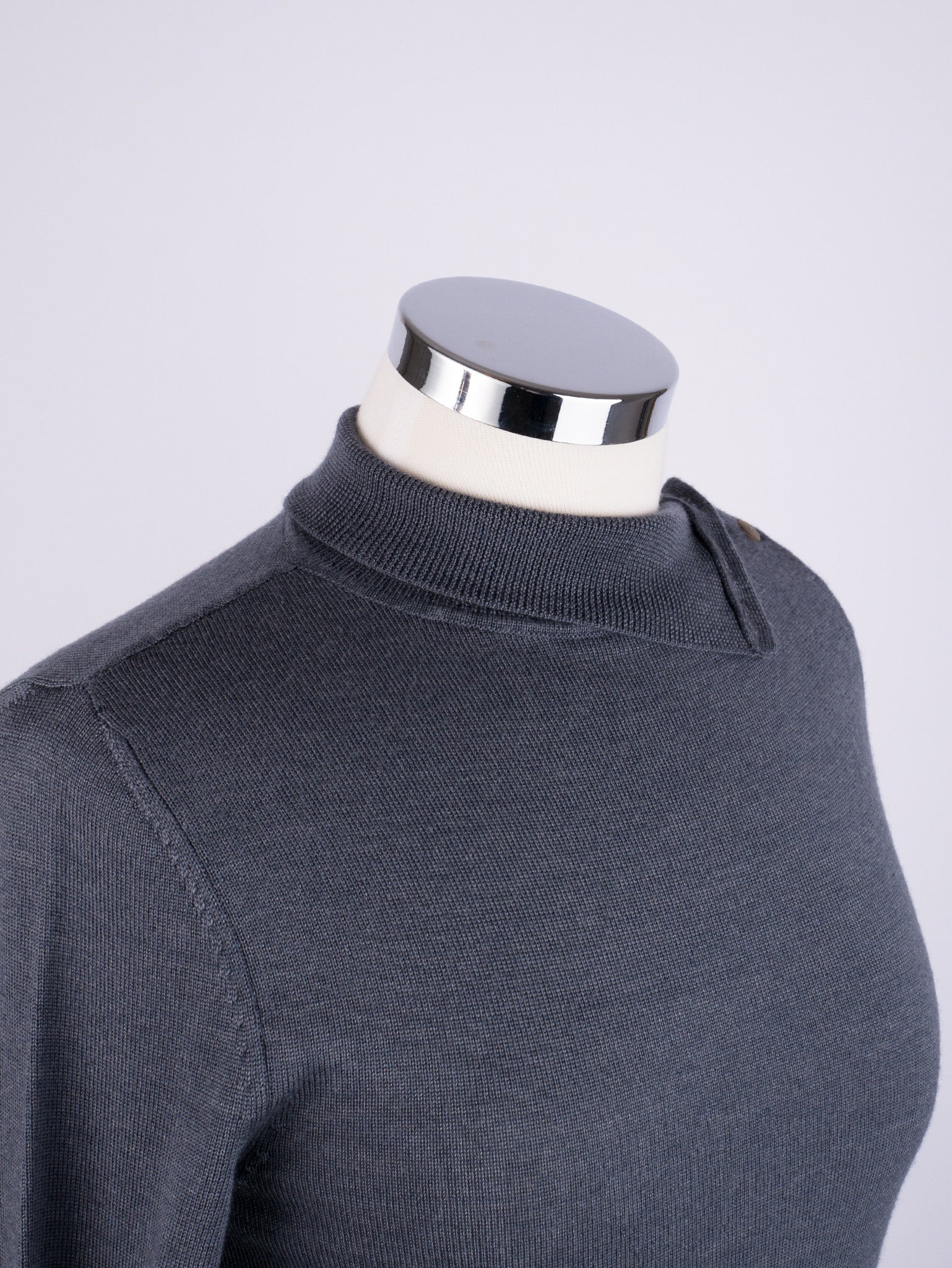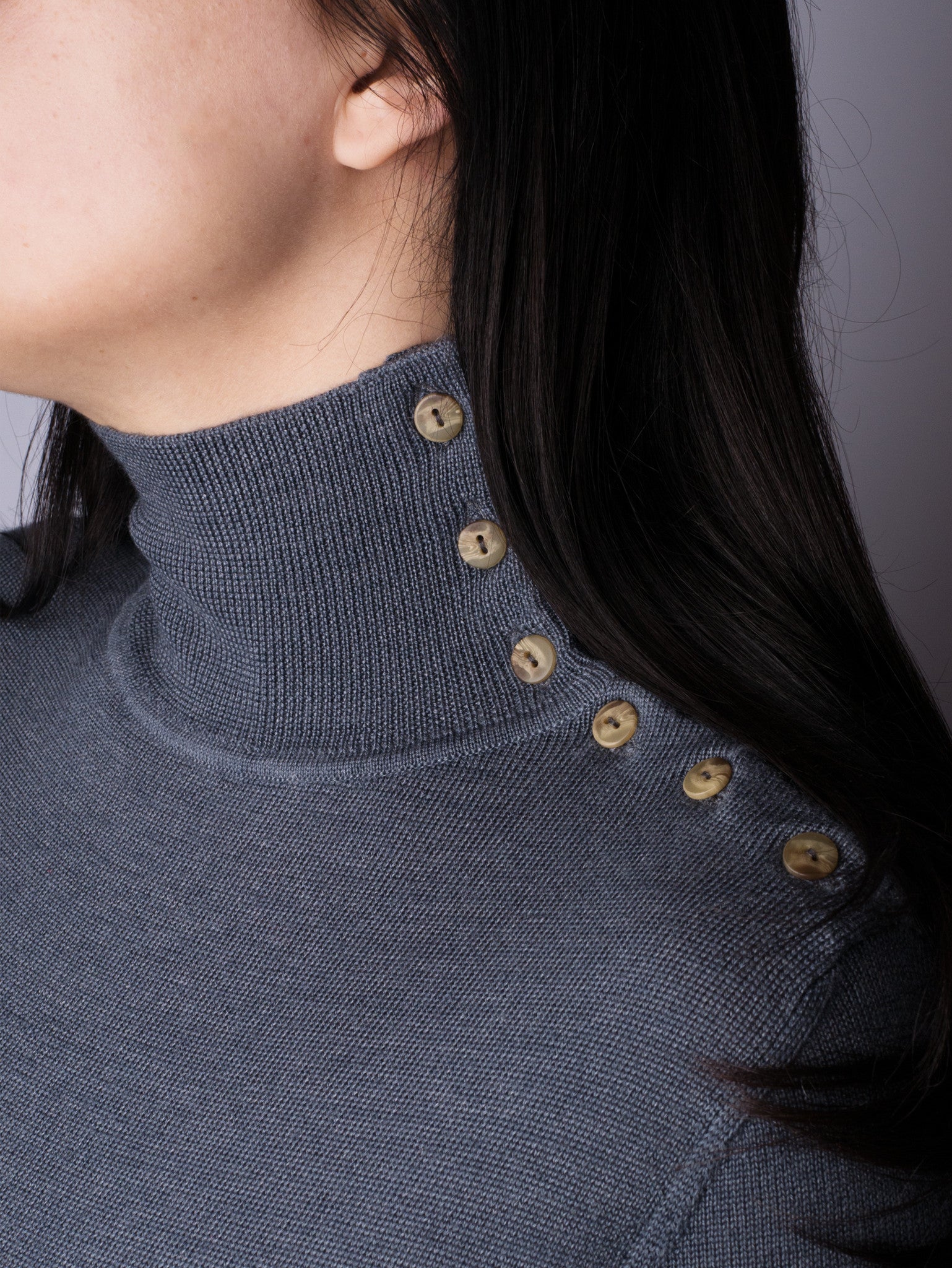 • The problem with conventional high neck jumpers is that as you pull them over your head they are forced to stretch. Over time this always leads to the fabric sagging until it is unrecognizable from its original shape. That is why we designed the Douglas Button Neck Jumper. Functioning buttons running along the shoulder and neck not only allow the neck to open and close eliminating any stretch, it also allows the jumper to be worn as an asymmetrical collar should you wish.