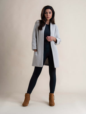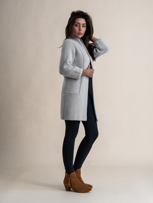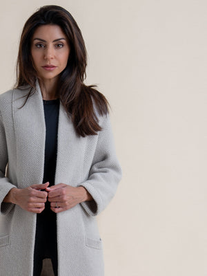 One of the most elegant knits. Constructed from a 3ply yarn in an overlapped tuck stitch, the double thickness collar tapers down to form deep hem pockets. The Edge to Edge cardigan is a piece that needs to be seen in the flesh to appreciate the craftsmanship that goes into its construction and gives it such a timeless elegance.