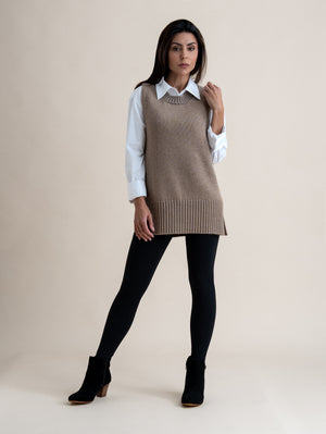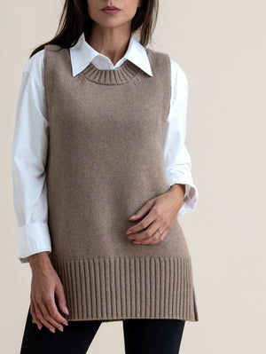 Constructed from a heavier weight than usual, the 5 ply long vest is designed to drape and hang properly over whatever you're wearing underneath. Featuring a ribbed neckline and an extra deep ribbed split hem.