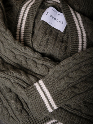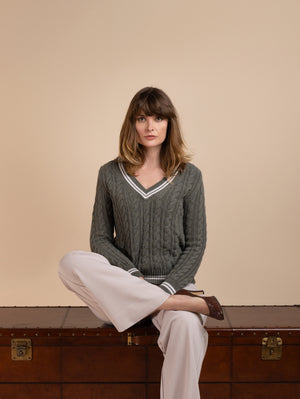 Cableknit with a low V neck. Double stripes to cuffs and collar