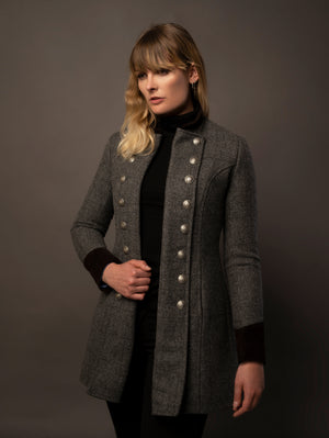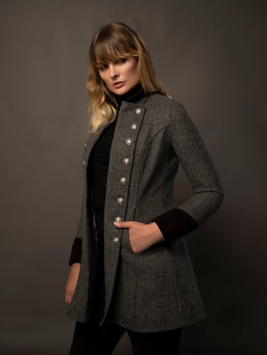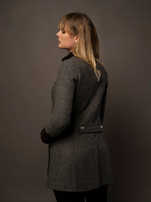 • The special edition of our Josephine features a calf suede chevron cuff and matching collar. The tweed itself is a deep grey with a soft black window pane check.