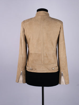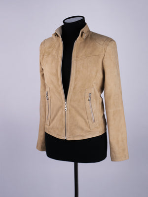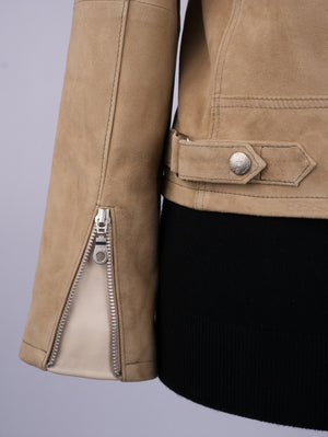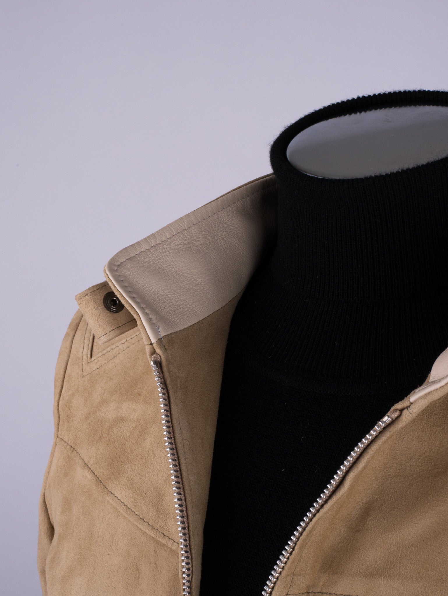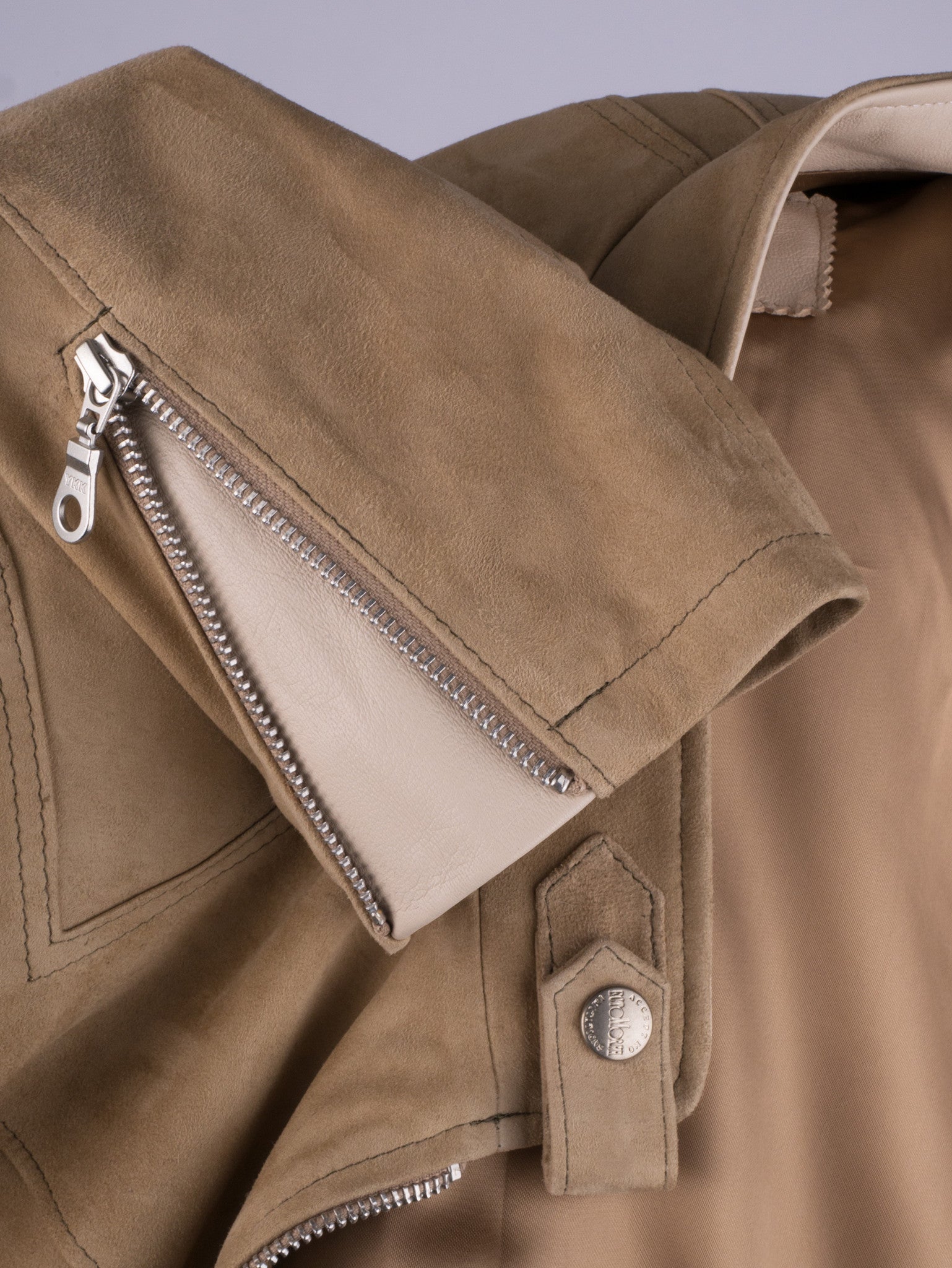 This particular variation is hand cut and stitched together from the highest grade Spanish goat suede making it not only beautifully soft and light, but strong and functional. The beige colour of this particular version has been contrasted with darker stitchwork and subtle calf leather inside the cuff and collar.